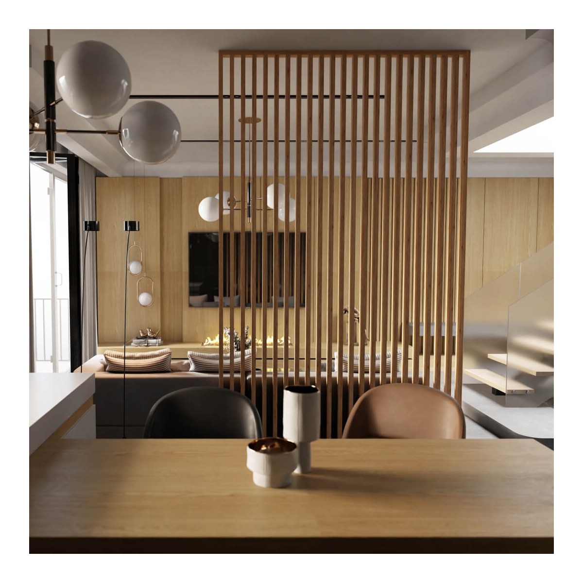 Die richtige Anordnung der Lamellen sorgt sowohl für eine subtile Trennung der Bereiche als auch für einen freien Lichtfluss, wodurch der Raum hell und optisch größer wirkt.