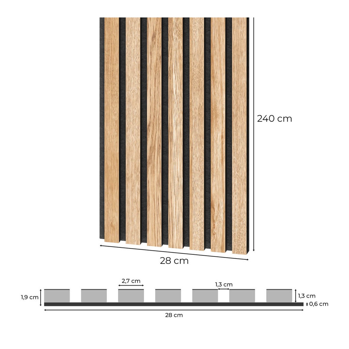 Die 60 x 240 cm großen, furnierten Akustikpaneele werden aus umweltfreundlichen Materialien hergestellt. Die Paneele haben akustische Eigenschaften und können in verschiedenen öffentlichen Räumen, z. B. Büros, sowie in Wohngebäuden verwendet werden. Sie können sowohl an Wänden als auch an Decken angebracht werden. Der 7 mm dicke Filz, der in schwarzer oder grauer Farbe erhältlich ist, wird durch Recycling von Kunststoffen gewonnen. Die Lamellen bestehen aus einseitig furnierten, 12 mm dicken schwarzen MDF-Leisten. Die MDF-Latte ist 2400 mm lang und 27 mm breit. Die schwarzen MDF-Latten sind unbehandelt furniert (nicht geölt) und in mehreren modischen Farben erhältlich. Der Abstand zwischen den Lamellen beträgt 13 mm.