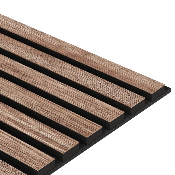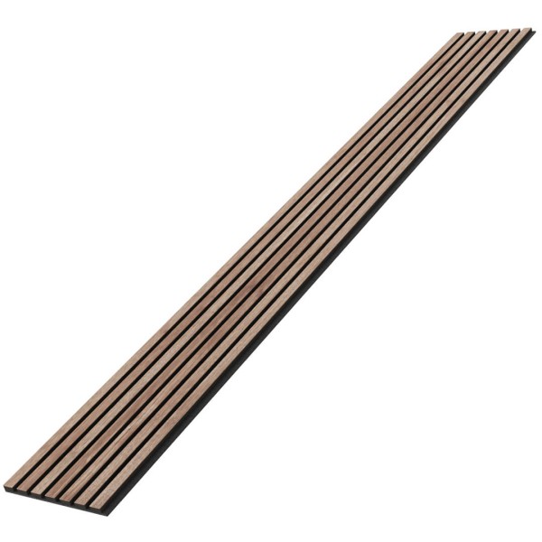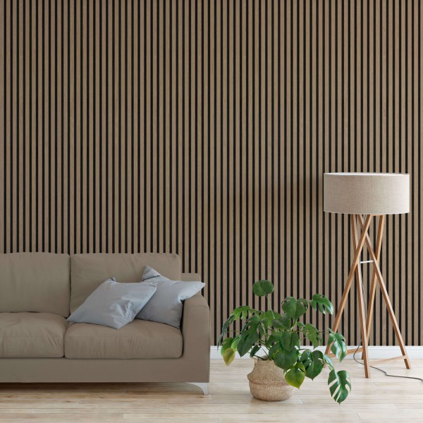 Die 60 x 240 cm großen, furnierten Akustikpaneele werden aus umweltfreundlichen Materialien hergestellt. Die Paneele haben akustische Eigenschaften und können in verschiedenen öffentlichen Räumen, z. B. Büros, sowie in Wohngebäuden verwendet werden. Sie können sowohl an Wänden als auch an Decken angebracht werden. Der 7 mm dicke Filz, der in schwarzer oder grauer Farbe erhältlich ist, wird durch Recycling von Kunststoffen gewonnen. Die Lamellen bestehen aus einseitig furnierten, 12 mm dicken schwarzen MDF-Leisten. Die MDF-Latte ist 2400 mm lang und 27 mm breit. Die schwarzen MDF-Latten sind unbehandelt furniert (nicht geölt) und in mehreren modischen Farben erhältlich. Der Abstand zwischen den Lamellen beträgt 13 mm.