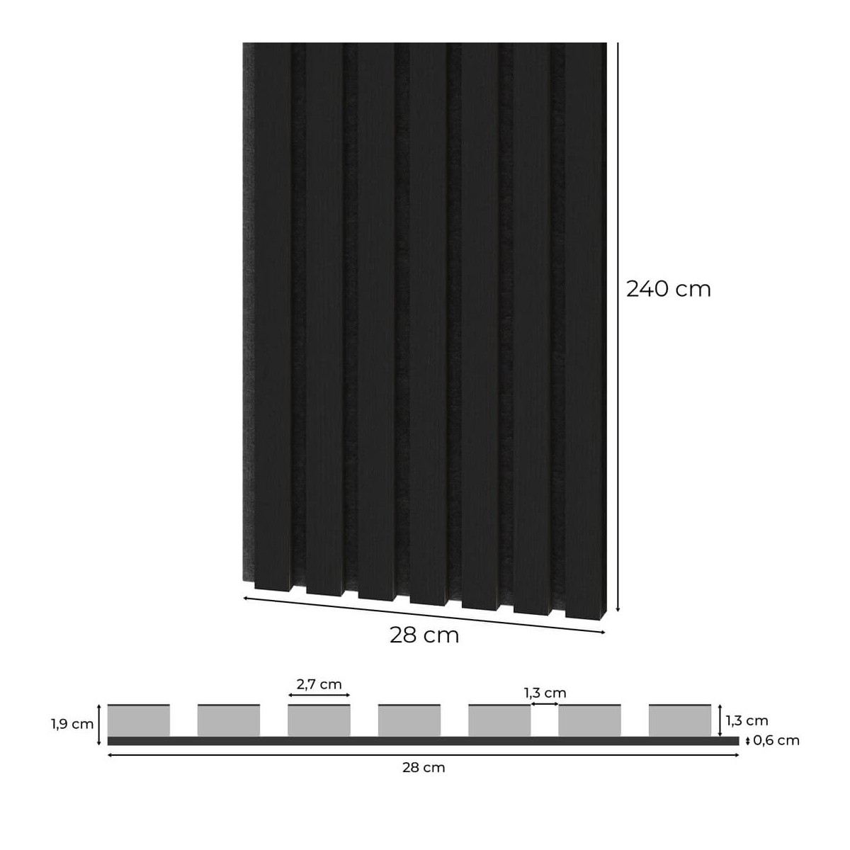 Die 60 x 240 cm großen, furnierten Akustikpaneele werden aus umweltfreundlichen Materialien hergestellt. Die Paneele haben akustische Eigenschaften und können in verschiedenen öffentlichen Räumen, z. B. Büros, sowie in Wohngebäuden verwendet werden. Sie können sowohl an Wänden als auch an Decken angebracht werden. Der 7 mm dicke Filz, der in schwarzer oder grauer Farbe erhältlich ist, wird durch Recycling von Kunststoffen gewonnen. Die Lamellen bestehen aus einseitig furnierten, 12 mm dicken schwarzen MDF-Leisten. Die MDF-Latte ist 2400 mm lang und 27 mm breit. Die schwarzen MDF-Latten sind unbehandelt furniert (nicht geölt) und in mehreren modischen Farben erhältlich. Der Abstand zwischen den Lamellen beträgt 13 mm.
