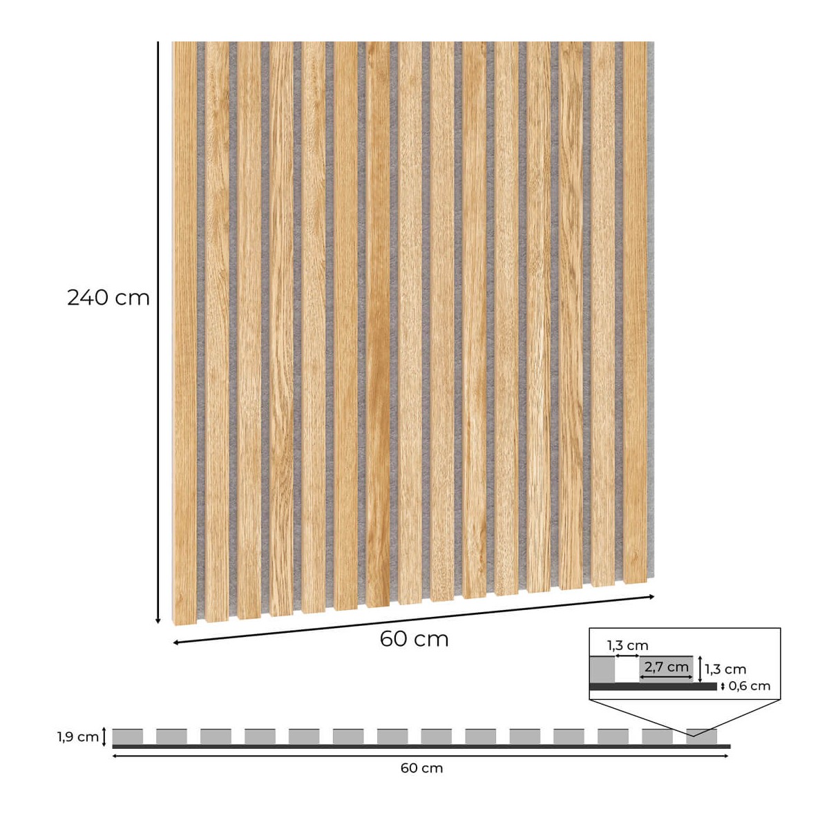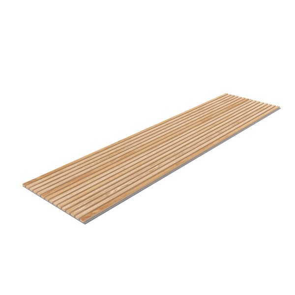 Die 60 x 240 cm großen, furnierten Akustikpaneele werden aus umweltfreundlichen Materialien hergestellt. Die Paneele haben akustische Eigenschaften und können in verschiedenen öffentlichen Räumen, z. B. Büros, sowie in Wohngebäuden verwendet werden. Sie können sowohl an Wänden als auch an Decken angebracht werden. Der 7 mm dicke Filz, der in schwarzer oder grauer Farbe erhältlich ist, wird durch Recycling von Kunststoffen gewonnen. Die Lamellen bestehen aus einseitig furnierten, 12 mm dicken schwarzen MDF-Leisten. Die MDF-Latte ist 2400 mm lang und 27 mm breit. Die schwarzen MDF-Latten sind unbehandelt furniert (nicht geölt) und in mehreren modischen Farben erhältlich. Der Abstand zwischen den Lamellen beträgt 13 mm.