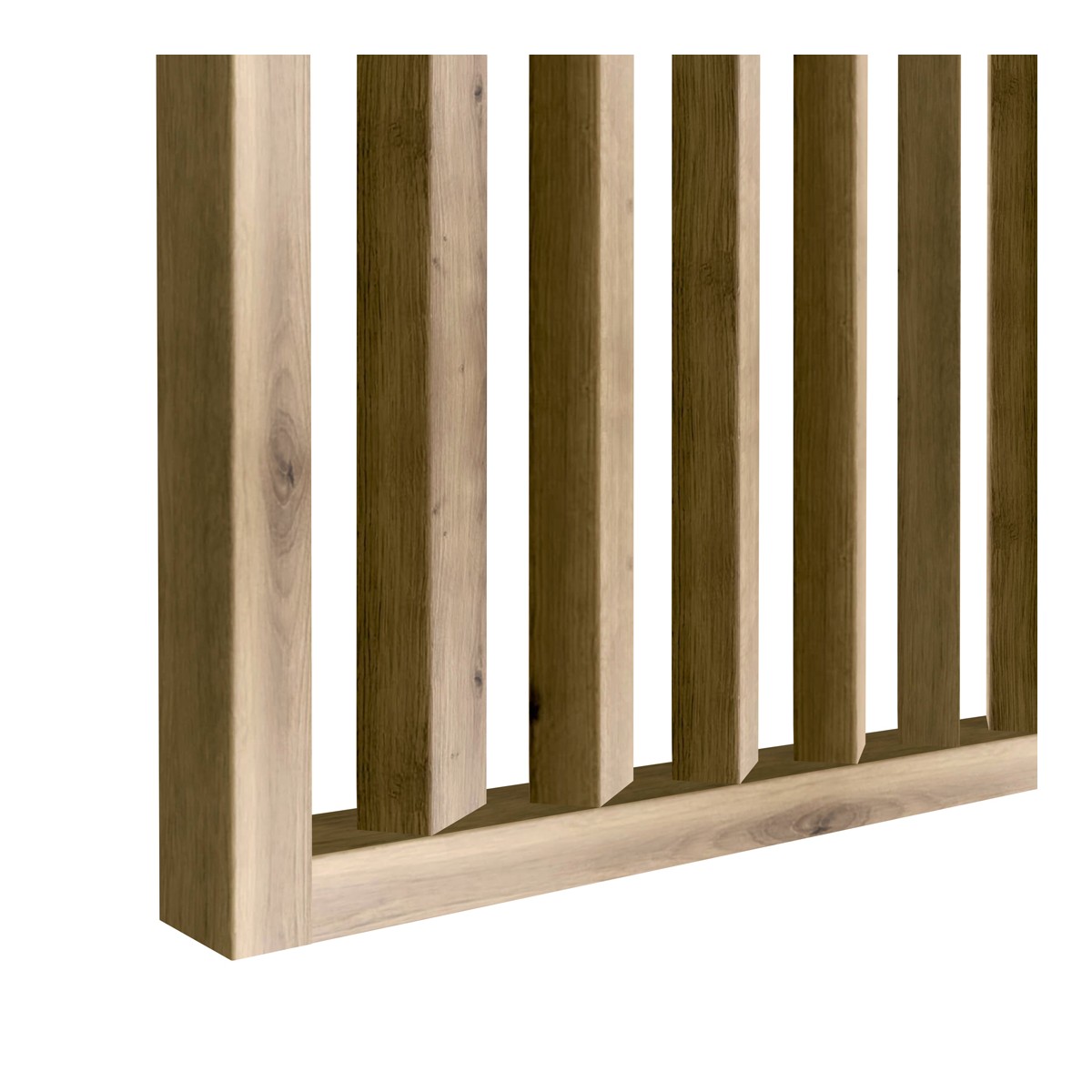 Die fertigen Wandpaneele aus schrägen Lamellen bestehen aus strapazierfähigem MDF, das Stabilität und ein lang anhaltendes ästhetisches Aussehen garantiert. Durch den geeigneten Abstand der Lamellen teilt die Wand den Raum effektiv und lässt gleichzeitig Licht ungehindert durch, wodurch der Raum optisch vergrößert und sein moderner Charakter betont wird.