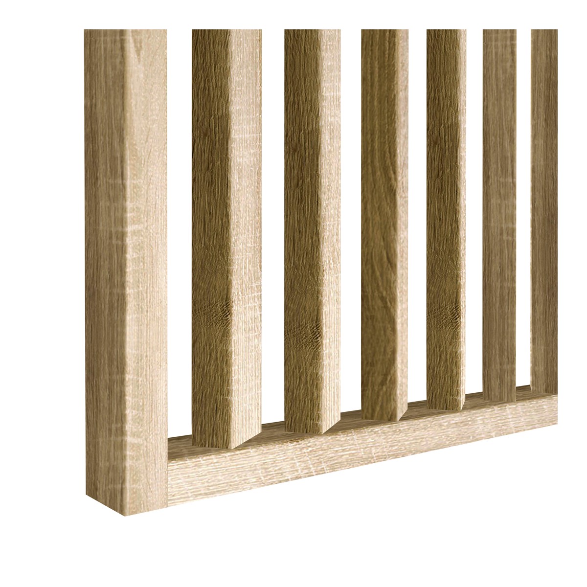 Die fertigen Wandpaneele aus schrägen Lamellen bestehen aus strapazierfähigem MDF, das Stabilität und ein lang anhaltendes ästhetisches Aussehen garantiert. Durch den geeigneten Abstand der Lamellen teilt die Wand den Raum effektiv und lässt gleichzeitig Licht ungehindert durch, wodurch der Raum optisch vergrößert und sein moderner Charakter betont wird.