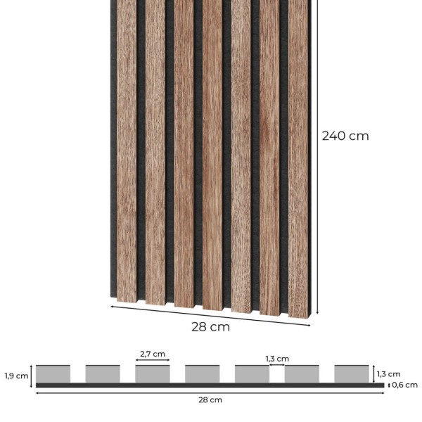 Fornirowane Panele Akustyczne 60 x 240 cm są wykonane z przyjaznych dla środowiska materiałów. Panele mają właściwości akustyczne i mogą być stosowane w różnych przestrzeniach publicznych, tj. biura, a także w budynkach mieszkalnych. Mogą być montowane zarówno na ścianie, jak i suficie. Filc o grubości 7 mm, który jest dostępny w kolorze czarnym lub szarym, jest uzyskiwany w procesie recyklingu tworzyw sztucznych. Lamele wykonane są z fornirowanych 1-stronnie listew z czarnego MDF o grubości 12 mm. Listwa MDF ma 2400 mm długości i 27 mm szerokości. Czarne listwy MDF są pokryte fornirem w stanie surowym (nieolejowanym), dostępnym w kilku modnych kolorach. Odstępy między listwami wynoszą 13 mm.
