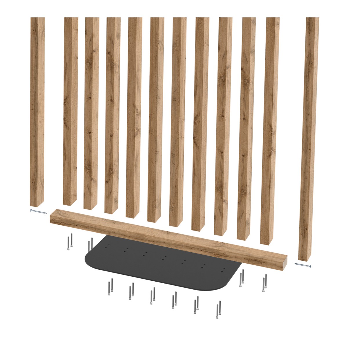 W zestawie otrzymujesz komplet elementów potrzebnych do stworzenia ścianki: pionowe lamele, stalową podstawę, elementy łączeniowe oraz czytelną instrukcję. Montaż jest prosty i szybki, nawet jeśli robisz to pierwszy raz!