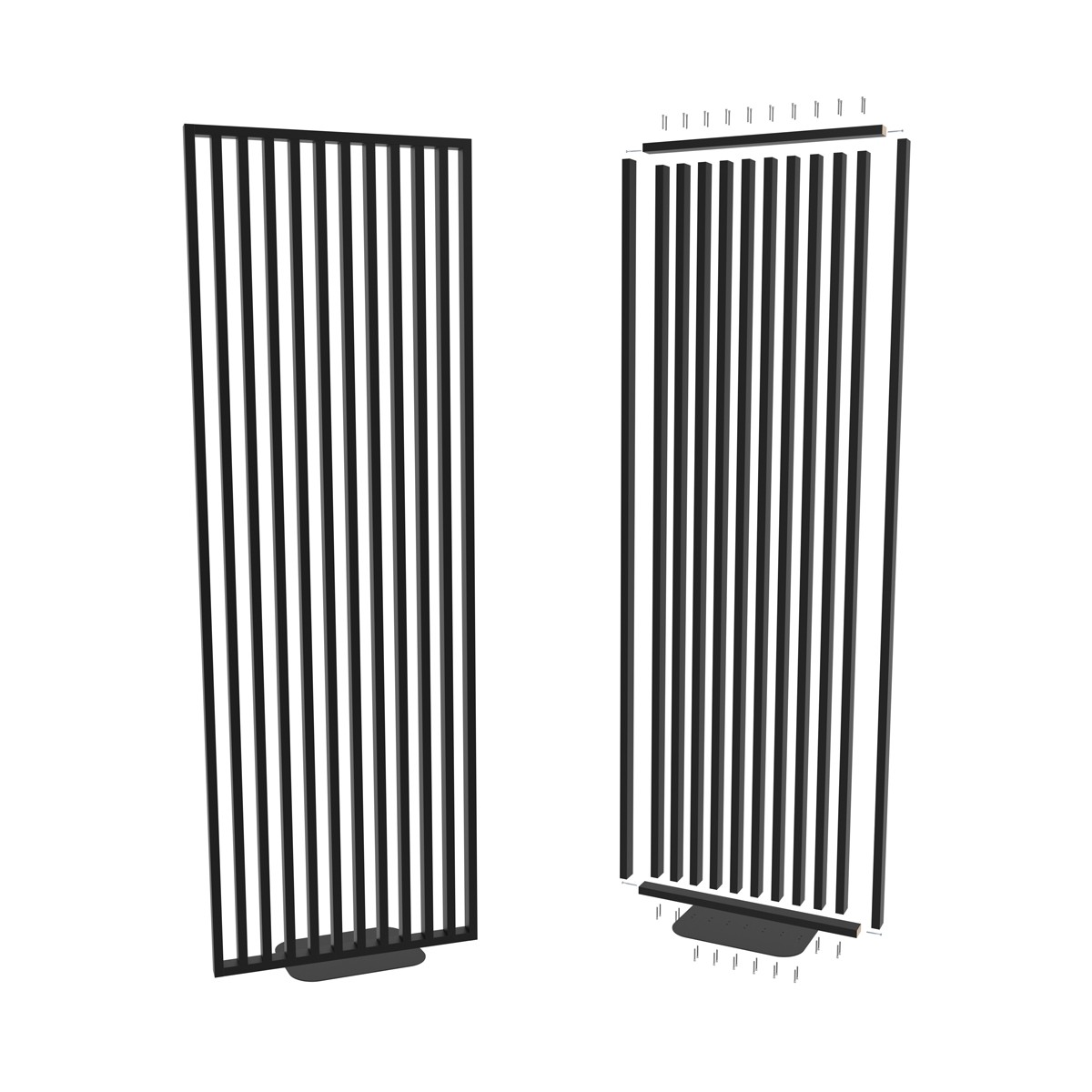 W zestawie otrzymujesz komplet elementów potrzebnych do stworzenia ścianki: pionowe lamele, stalową podstawę, elementy łączeniowe oraz czytelną instrukcję. Montaż jest prosty i szybki, nawet jeśli robisz to pierwszy raz!
