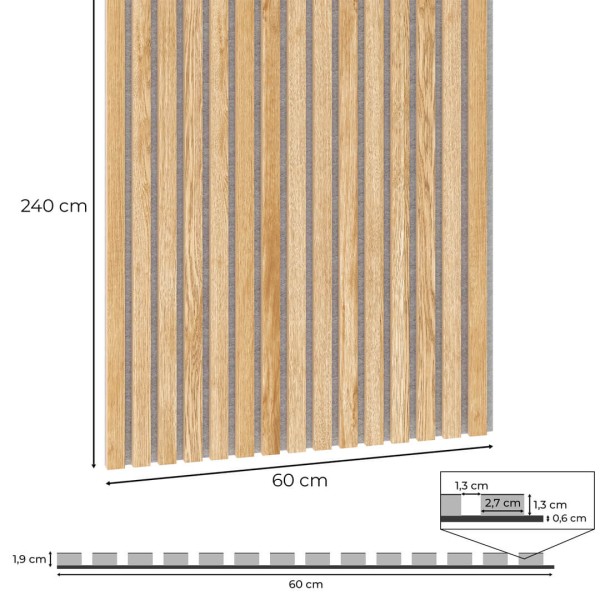 Panurile acustice furniruite 60 x 240 cm sunt realizate din materiale ecologice. Panourile au proprietati acustice si pot fi folosite in diverse spatii publice, precum birouri si cladiri rezidentiale. Se pot monta atat pe perete cat si pe tavan. Pâsla de 7 mm grosime, care este disponibilă în negru sau gri, este obținută printr-un proces de reciclare a plasticului. Lamele sunt realizate din lamele MDF negre furniruite pe o singură față, cu grosimea de 12 mm. Banda MDF are 2400 mm lungime și 27 mm lățime. Benzile negre din MDF sunt acoperite cu furnir brut (neuns), disponibile în mai multe culori la modă. Distanța dintre benzi este de 13 mm.