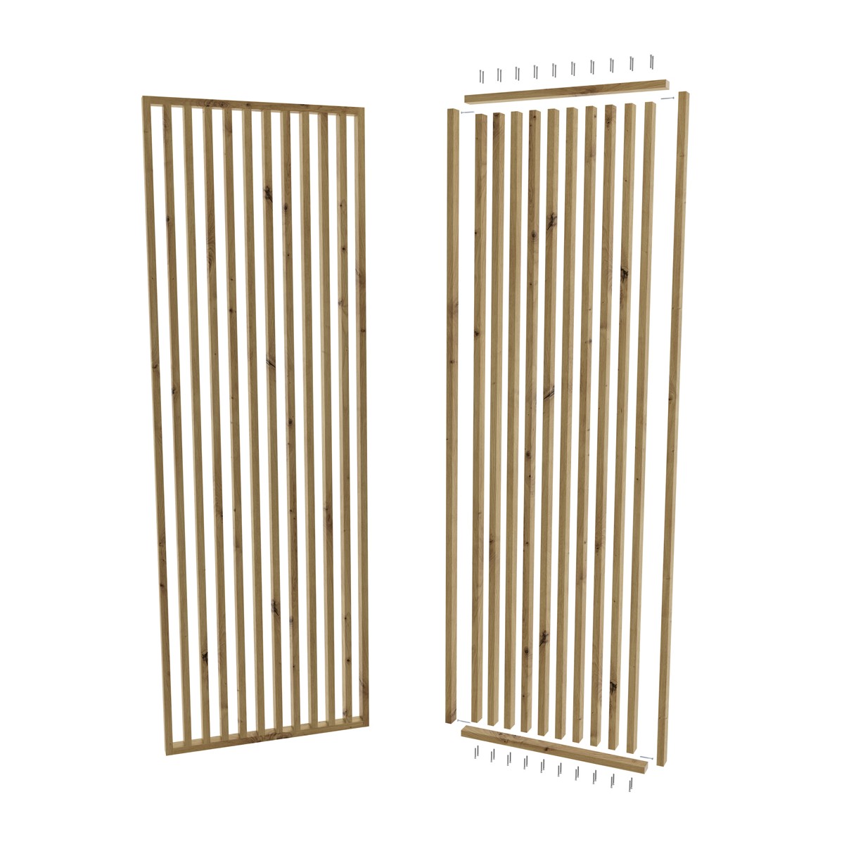 Pereții ajurați gata fabricați, realizați din lamele înclinate, sunt confecționați din MDF rezistent, care garantează stabilitate și aspect estetic pentru o lungă perioadă de timp. Distanța adecvată dintre lamele face ca peretele să împartă eficient spațiul, permițând în același timp luminii să circule liber, mărind vizual camera și subliniind caracterul său modern.